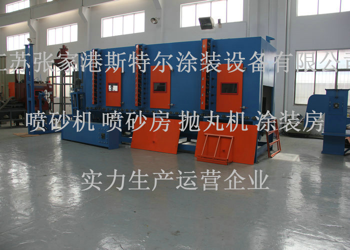 方形坩堝產品內壁處理要求而專門設計的專用型輸送式自動噴砂機,適合需求公司所提供的產品。根據需求公司對產品效率的要求,本機設置一套自動輸送線,共分五段線體。噴砂艙內共設三個噴砂位,工件通過輸送線體帶動步進方式分別在三個噴砂位進行噴砂加工清理,噴砂區域內共布置20支普壓高速噴砂咀,在噴砂區第一個噴砂位布置8支噴咀噴工件內底面,在噴砂區第二個噴砂位布置6支噴咀噴工件內前后側面,在噴砂區第三個噴砂位布置6支噴咀噴工件內左右側面,噴咀可根據加工需要,適當調整其噴射角度,其自動化程度較高。每個工件需間歇進行三次噴砂清理加工,才能完成整個內表面的清理。在出口處設有翻轉機構,用于傾倒內部的砂料,該動作自動完成,無需人工操作。 噴砂環節環節